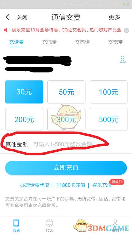 3、选择页面上的充值金额或者是自定义金额,然后点击页面下面的“立即充值”。