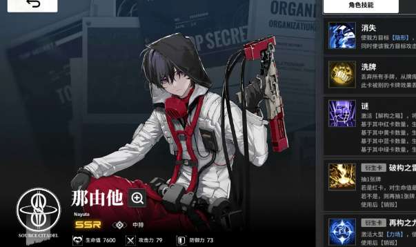 3、过牌位:SSR那由他,开服up,所有队伍都可以携带的最强过牌手。一技能隐身和大招的衍生卡拥有强保护能力和辅助输出能力,二技能洗牌作为全游最强过牌技能,在高效刷新小红帽队长技的同时,也可以触发其他队友的弃牌效果如小红帽二技能锦囊,约书亚衍生卡黑潮等。