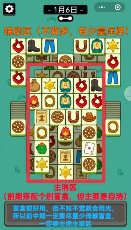 今天两个方形主攻区,基本上可以相互消除(搭配个别盲盒)。所以辅助区的牌不少,但基本上用不到(有用就用,不用省)。