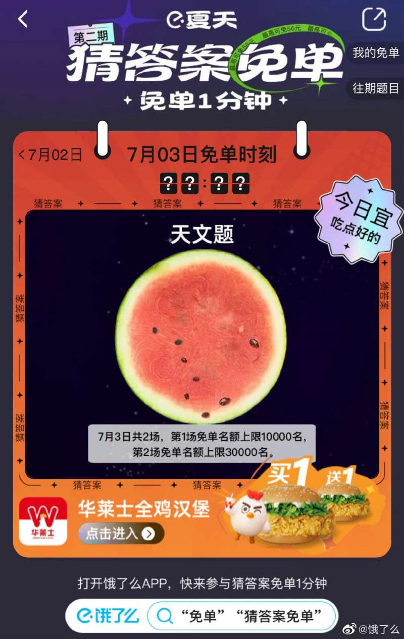 饿了么7月3日免单1分钟的题目是和华莱士合作的,题目主题是天文题,里面西瓜和西瓜子是重点。下面小编就为大家带来了饿了么免单一分钟7.3答案,饿了么免单7月3日答案分享,希望对你有所帮助。