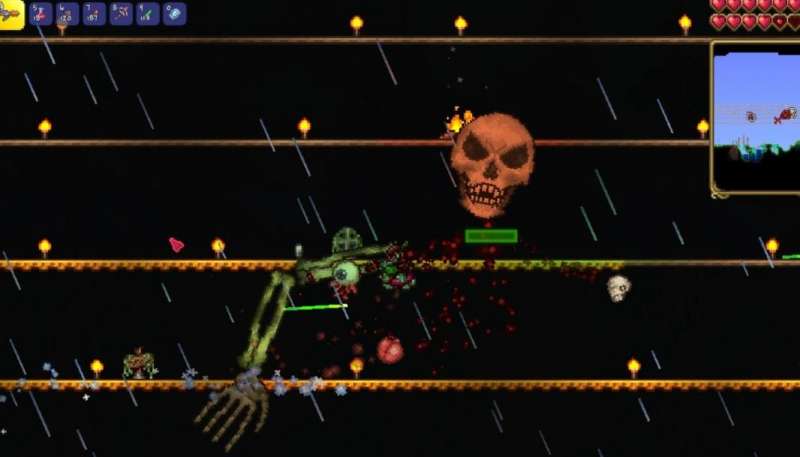 首先玩家需要前往猩红之地,拿出准备好的三个心脏,将其全部敲碎掉后,即可召唤出克苏鲁大脑。它的四周会飞舞着各式各样的眼球,玩家需要躲避这些眼球,并对保护在中心的心脏进行攻击。当击杀掉克苏鲁大脑以后,接着我们就要去寻找骷髅王,其外表就是一个巨大的骷髅头,通常会在夜晚出现。