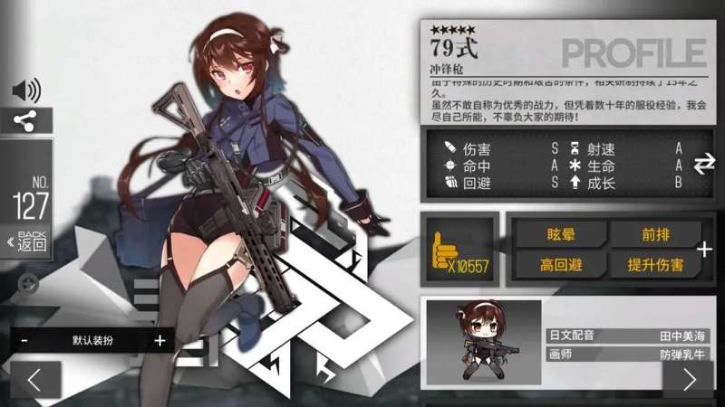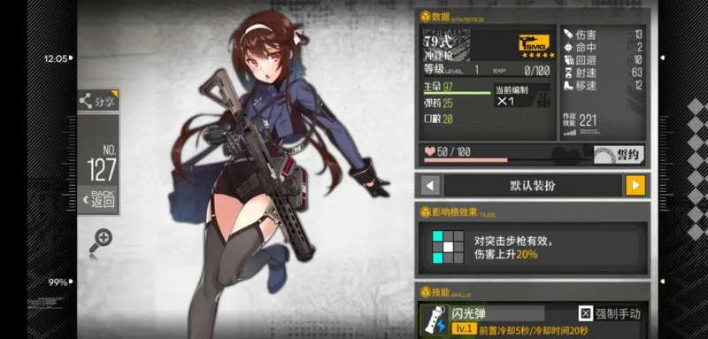 在少女前线中,79式的定位属于投掷物冲锋枪,通过建造取得。闪光弹技能的主要作用是限制敌人的位移或者攻击,闪光弹技能在本质上是不会直接对敌人产生数值伤害的,所以输出属性一般不会用作考虑。这一点对应了早期的79式加伤害的专属弹匣就显得冲突,就算加了伤害也只能依靠普攻进行输出。