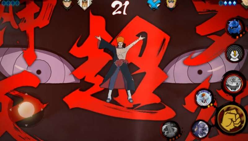 佩恩的先手能力非常强,在对战过程中擅长主动出击寻找机会,具有强消耗和强控制的特点。面对移动速度比较慢的忍者,可以使用攻击距离较远的一技能进行消耗。佩恩的缺点是比较惧怕攻击距离比自己更远,或者位移技能较多的忍者。