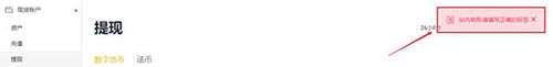 注意:由于充值标签币到币安时必须填写标签,所以内部转账时,如系统检测到一笔提现未填写标签(勾选了【没有备注】),会直接拒绝该笔提现并给出如下提示。请填写正确标签后再行尝试。