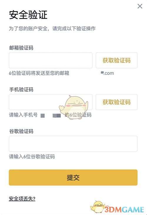 5、点击【提交】后,需要进行安全验证。如果还没有绑定过,会提示您绑定安全项;如果已绑定过,需点击【获取验证码】并输入所有已经绑定的安全项的验证码。