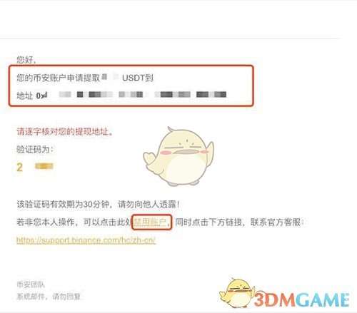 7、请核实您的提现币种、金额和地址。在安全验证页点击【提交】之前,这笔提现不会被授权执行。若非您本人操作,请点击邮件底部的【禁用账户】并联系币安客服。