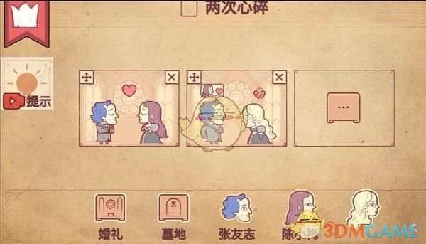 3、玩家将墓地放入第三个框,再将张友志放在墓碑里,然后将陈小梅放在第三个框,陈小梅看到张友志死了心就碎了,如图所示。