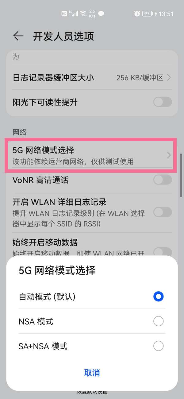 3、点击5G网络模式选择,选择NSA模式或者SA+NSA模式即可。