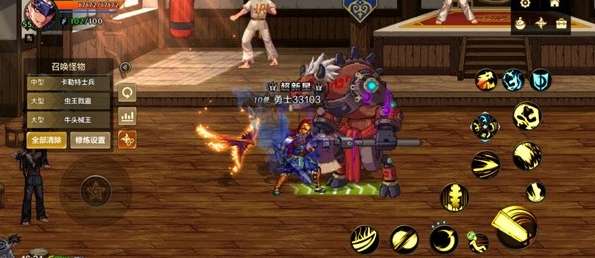 其中,地下城修练场的对战对象是怪物,其中小型怪物的代表是哥布林,中型怪物的代表是卡勒特士兵,大型怪物的代表是牛头械王,无法浮空倒地怪物的代表是虫王戮蛊,点击对应怪物后即可召唤出来进行对练。