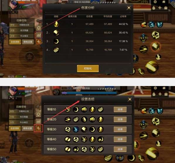 召唤怪物右侧的三个按钮分别是【重置技能CD】,可在施放技能后重置CD;【查看伤害分析】,可在一套连招后查看技能的使用次数、总伤害、平均伤害和伤害占比;【设置连招】,可引入系统推荐的连招顺序并进行练习。
