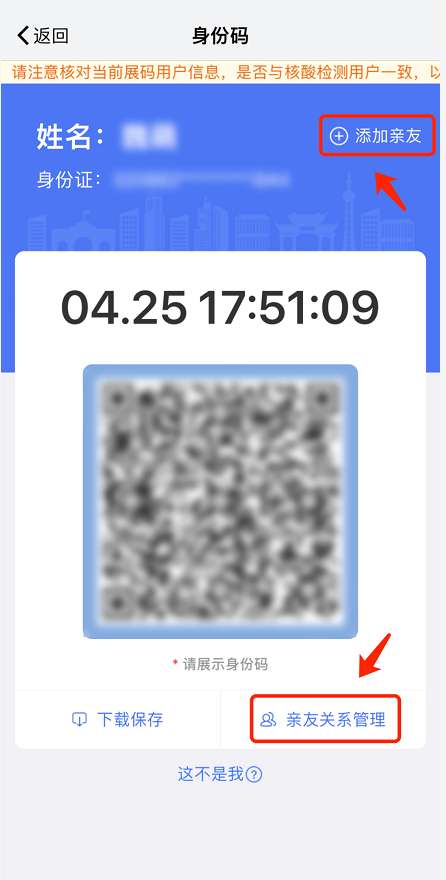 2、进入身份码页面后点击右上角“添加亲友”,上传亲友身份信息,然后返回页面点击下方“亲友关系管理”。