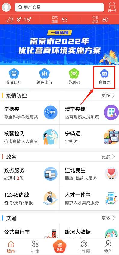 1、打开“我的南京”app,登录后点击首页上的“身份码”。