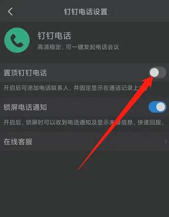第四步:最后找到置顶钉钉电话,开启后面的开关就可以置顶钉钉电话了。
