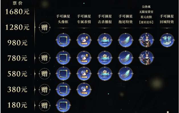 购买音乐剧门票将会随票赠送手可摘星回城特效、拖尾特效、荣耀播报、专属表情及头像框等道具,不同票价对应的赠送道具也有所不同,大家可以灵活选择。