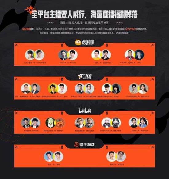 从7月20日起,在斗鱼、虎牙、BILIBILI及快手等平台,众多主播将双人成行,邀你一起体验欢乐无比的2V2V2整活大戏!虎牙直播文森特、姿态、霸哥,斗鱼直播洞主、树奈奈、周淑治、doinb,B站直播菜菜姐、德云色、布锅锅,快手猫神、追风、禹神等各大知名主播、解说、电竞选手将齐聚斗魂竞技场,开启竞技之旅。