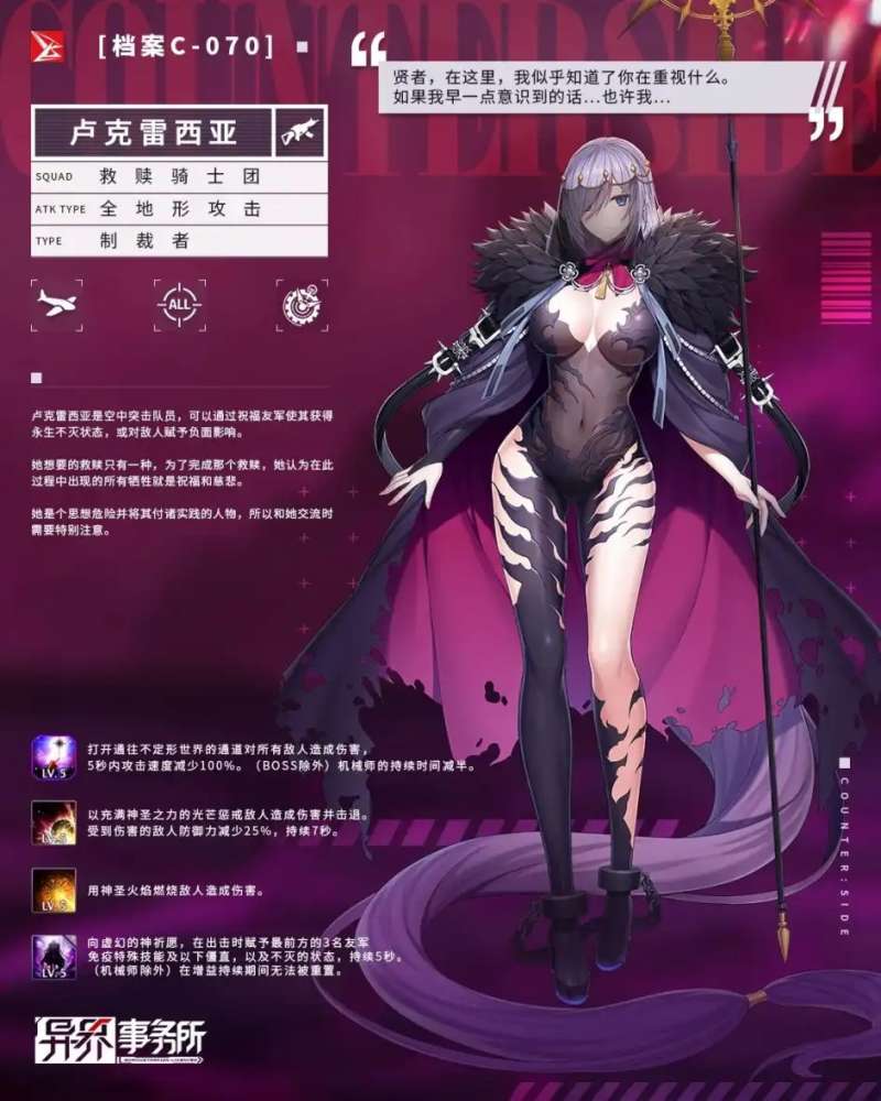 圣女是功能性3费制裁者突击,面板很差,但作为功能性角色不是很重要。普攻远距离范围伤害,被动出场时使最前方的三位友军获得5s免疫特殊技以下僵直和不死效果(机械除外,buff持续时无法重复出击,升满不死结束时回复最大血量10%),特殊技造成远距离范围伤害并击退,受害单位防御减少25%7s,大招造成大范围伤害并使受害单位5s攻速减少100%,对机械持续时间减半(升满大招必中)