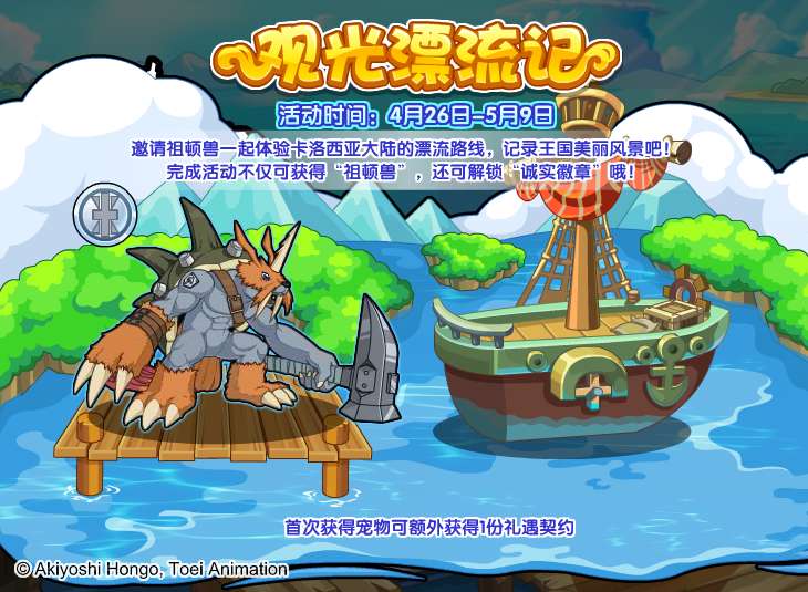 邀请祖顿兽一起体验卡洛西亚大陆的漂流路线,记录王国美丽风景吧!完成活动不仅可获得“祖顿兽”,还可解锁“诚实徽章”哦!