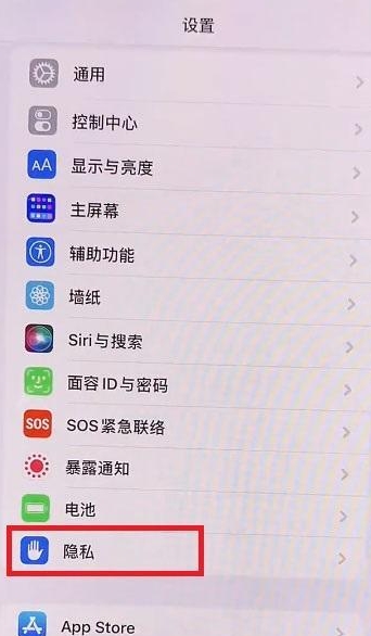 1、首先我们需要打开设置,然后在设置界面中,找到【隐私】点击隐私功能进入到界面中;