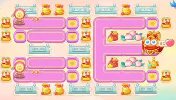 4.打掉上下两个障碍之后,把刚才放置的箭塔升满,然后在上面放一个箭塔升到2级,有钱之后也升满,锁定右边区的钱袋。