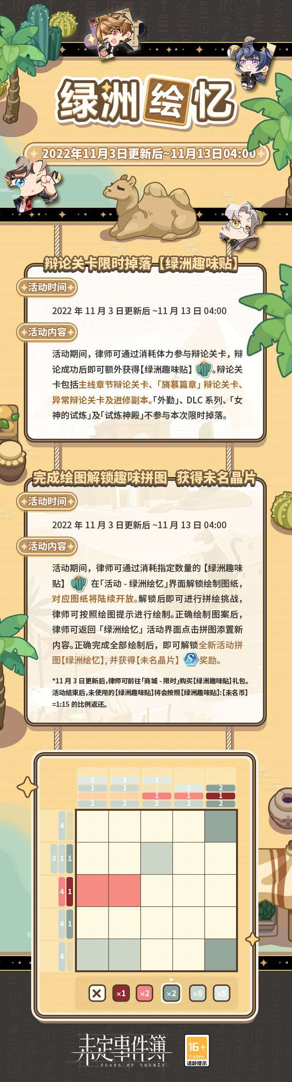 2、活动期间,律师可通过消耗指定数量的【绿洲趣味贴】在「活动-绿洲绘忆」界面解锁绘制图纸,对应图纸将陆续开放。解锁后即可进行拼绘挑战,律师可按照绘图提示进行绘制