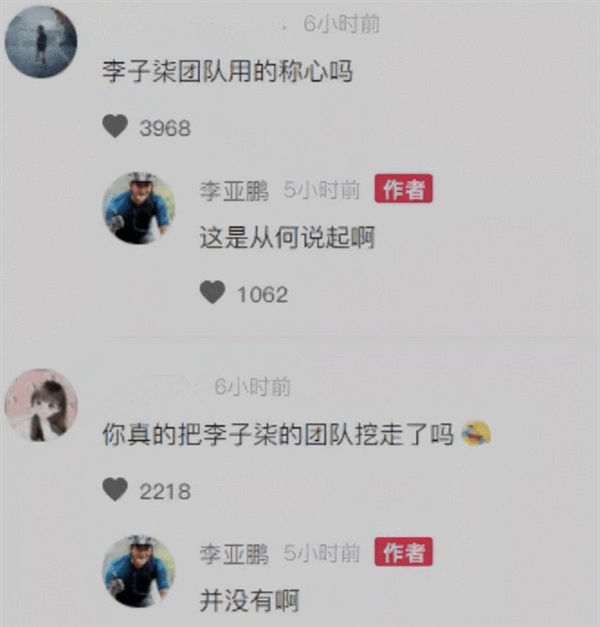 网友@己所不欲勿施于人 在留言中问李亚鹏:“李子柒团队用的(得)称心吗?”李亚鹏回复:“这是从何说起啊”。@网友94老姑娘 在留言问中李亚鹏:“你真的把李子柒的团队挖走了吗?”李亚鹏回复:“并没有啊”。