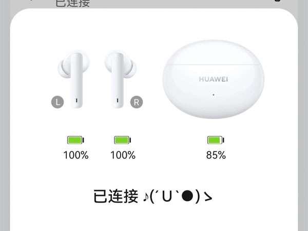 小编提示:耳机支持首次开盒免按键配对,首次使用时,打开充电盒盖,等2秒左右,会自动开机并进入可配对状态,此时白灯闪烁。再次使用时,耳机开盒,连接成功后手机自动弹出弹框,显示耳机和盒子电量。(需配合EMUI 10.0及以上的华为手机/平板)