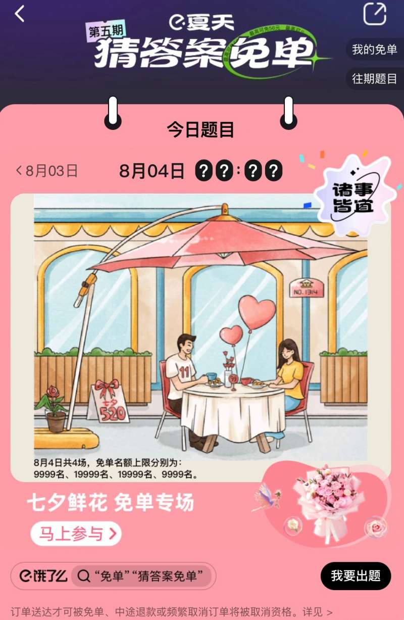 饿了么8月4日的题目已经更新,今天是七夕专场,所以和七夕有关,在免单时间上应该会有一些七夕相关的数字。下面小编就为大家带来了饿了么免单8.4答案,饿了么免单一分钟8.4答案分享,感兴趣的小伙伴们快跟小编一起来看看吧!