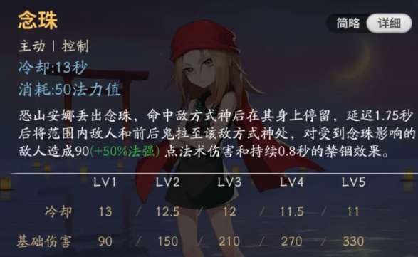 三技能是一个延迟触发的技能,扔出的飞行物不会被小兵野怪阻拦。由于三技能具有延迟性与前后鬼的固定范围输出。导致安娜虽然能获得很好的线权,但游走GANK却效果一般。在对线时我们可以先手三技能套住敌方式神,再控制效果出发后再使用一二技能向前输出。在己方打野来GANK时我们也可以利用三技能阻止对方撤回塔下。在团战中,由于念珠具有范围控制与聚拢效果(类似花鸟卷的大),因此我们要选择尽可能将念珠扔给对面核心位置或往对面人群里扔,以便造成范围控制!