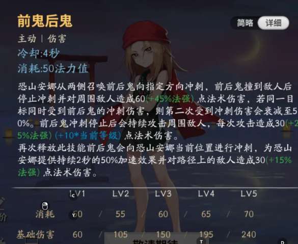 要注意的是,召唤出来的两只鬼并没有血条,只能存活固定的一段时间,同时这段固定时间不受法强,血量,CD等任何属性的加层。前后鬼的持续时间及变化会在召唤后显示在安娜的血条上方,可以被双方玩家所共同掌握。在召唤前后鬼后安娜身旁会出现一个以始终安娜为圆心,并随安娜移动而移动的圈形的指示线。当因安娜的移动而使前后鬼脱离出该指示线时前后鬼便会无视剩余持续时间,直接消失。这就对安娜的走位有一定的要求了。同时,一技能一段的释放在没有单位阻挡的情况下是固定路径长度,而且离指示线边缘相对较近,千万别放了一段想着利用鬼输出,却自己马上反方向跑了哦!