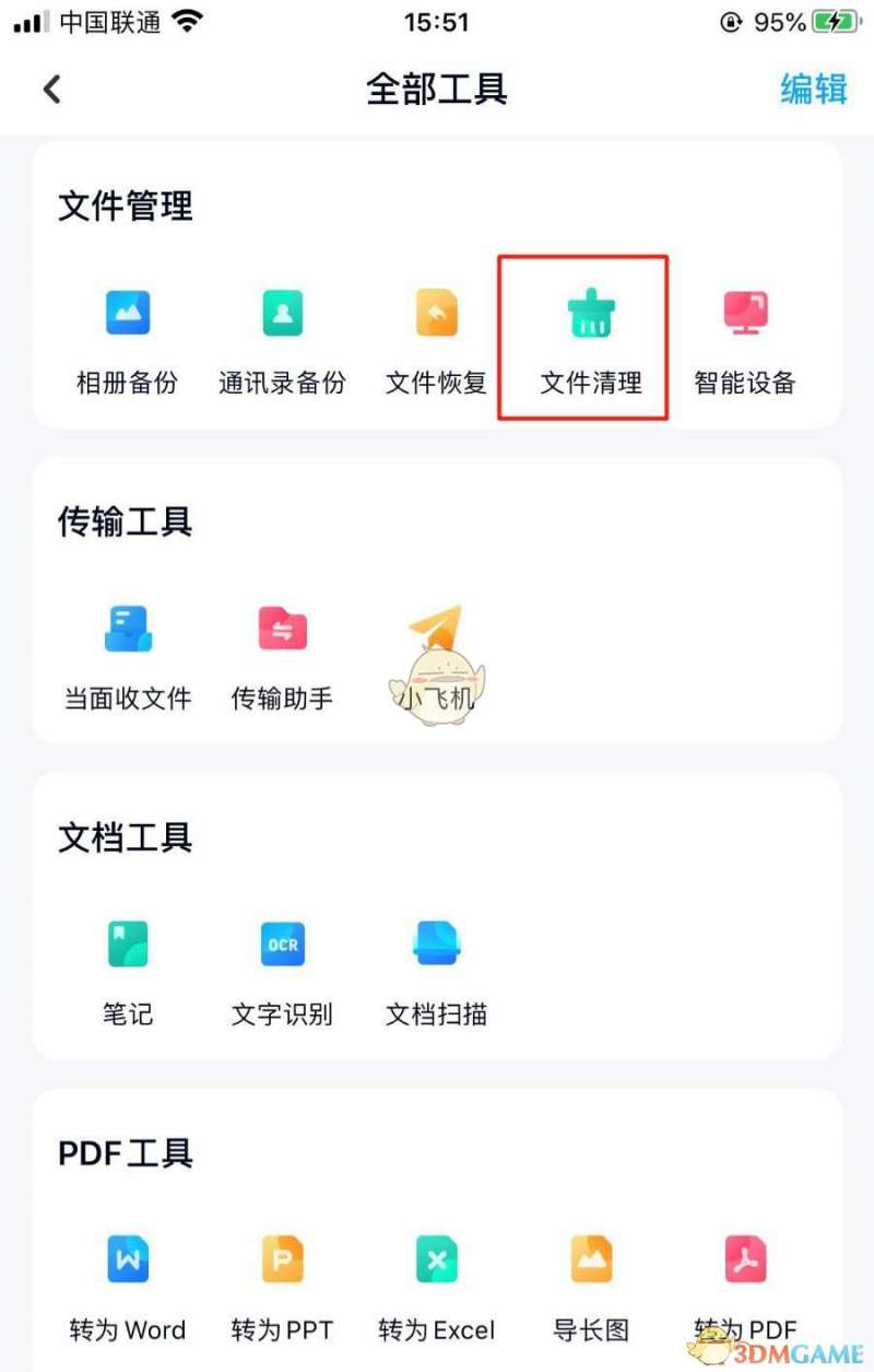 2、在“全部工具”界面中,选择“文件管理”区域中的“文件清理”图标。