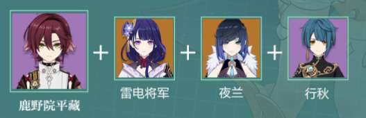 这套阵容利用鹿野院平藏打出双扩散,在依靠元素爆发的牵引特性进行聚怪,配合雷电将军进行输出。