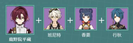 这套阵容利用鹿野院平藏的攻击进行扩散,提高行秋,香菱脱手技能的伤害,在利用班尼特提供的攻击力加成,提高鹿野院平藏的伤害。