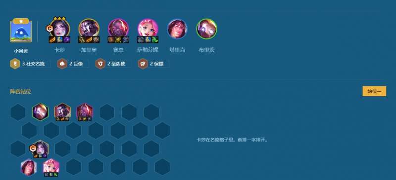 在铲铲中社交名流这个羁绊一直以来都是多个阵容必备的,因为他就算只有一个人有这个羁绊也是算战力加成的,1社交名流有着18%的伤害加成。2社交名流有着4/秒的回复手段,而3社交名流可以有着33%的已造成伤害的回复能力,可以说是非常给力了。我们这个阵容的输出方式就是靠着高名流格子的加成,让卡莎能够最大化自己的输出。算是一个单核阵容,阵容成型之后的强度也是很不错的。