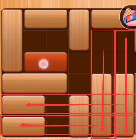 第九步:第四列的积木往上推、第五排、第六排的积木均往左边推、第五列、第六列的积木均往下推: