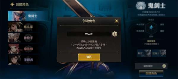 5、点击右下角的“昵称”自定义你的角色昵称,也可以随机设定,再点击“创建角色”,dnf手游昵称大全2024;