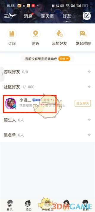 2、然后在聊天的页面中点击【好友】,之后在社区好友中我们选择需要取消关注的【用户】点击;