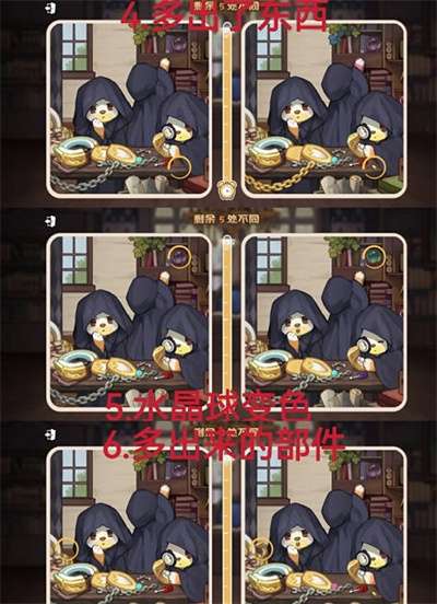 13、左边的部件花纹不同。14、变成了金链子。15、新买的桌子。16、弹珠颜色不一样。17、多了的扣子。18、窗户栏杆多了一个。