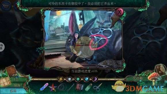 右侧箱子(点落布),拉链——用纸夹(拉开箱子)——铅笔(箱里)、钩针(箱外)