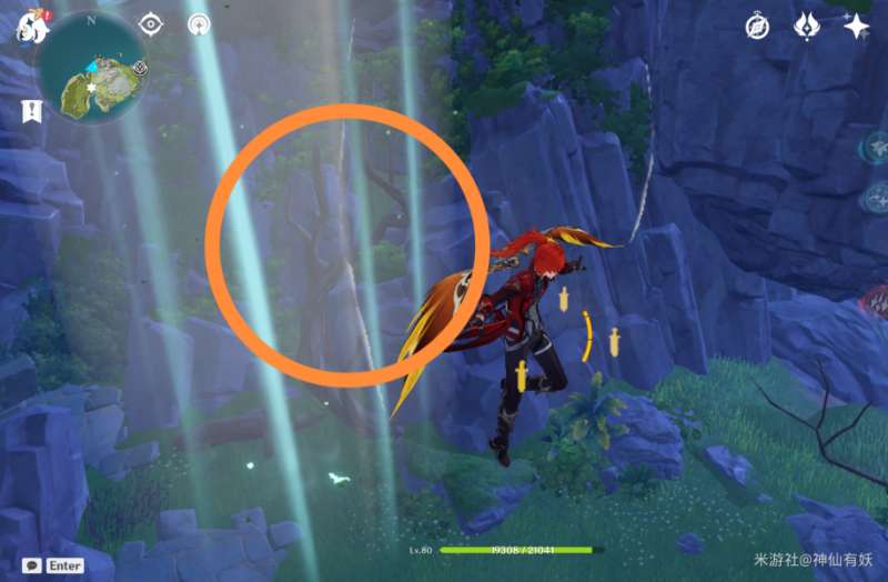 从山顶上往下飞,来到地图这个位置,就可以看到我们第五个凝核了