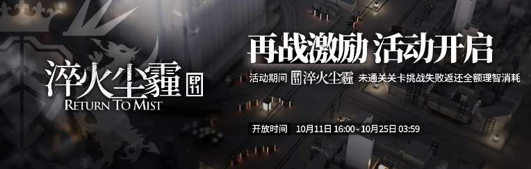 活动说明:活动期间,【淬火尘霾】任意难度环境下的未通关关卡,挑战失败将返还全额理智消耗
