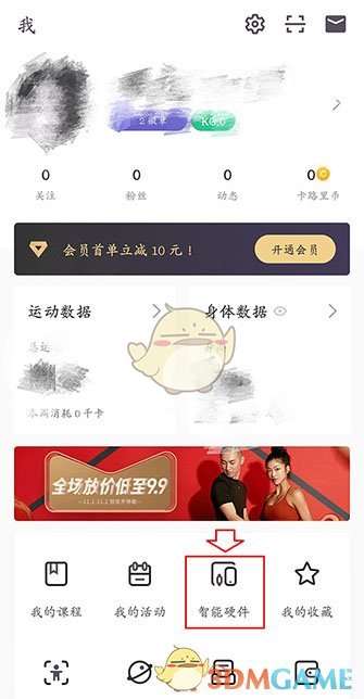 1、打开蓝牙和最新版本Keep软件,登录后点击右下角的“我”,在下方的菜单栏中找到“智能硬件”这个选项。
