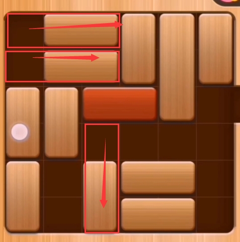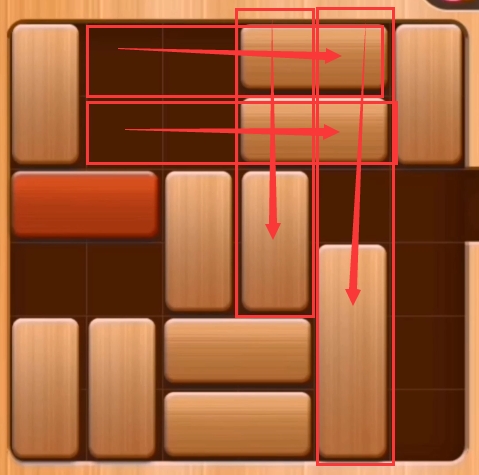 第一步:第三列的积木往下推、第一排、第二排的积木均往右边推:
