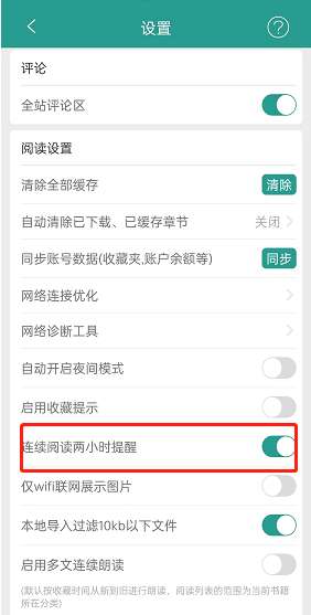 3、开启如图的【连续阅读两小时提醒】就可以了。