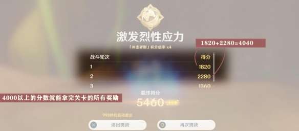 第四关只上场试用角色,完成第一轮、第二轮的战斗,我们都能达到4000分左右。
