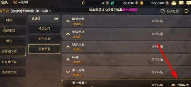 3、进入组队频道以后,点击箭头所指的【创建队伍】。