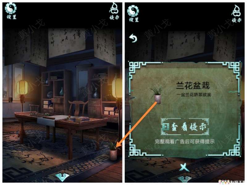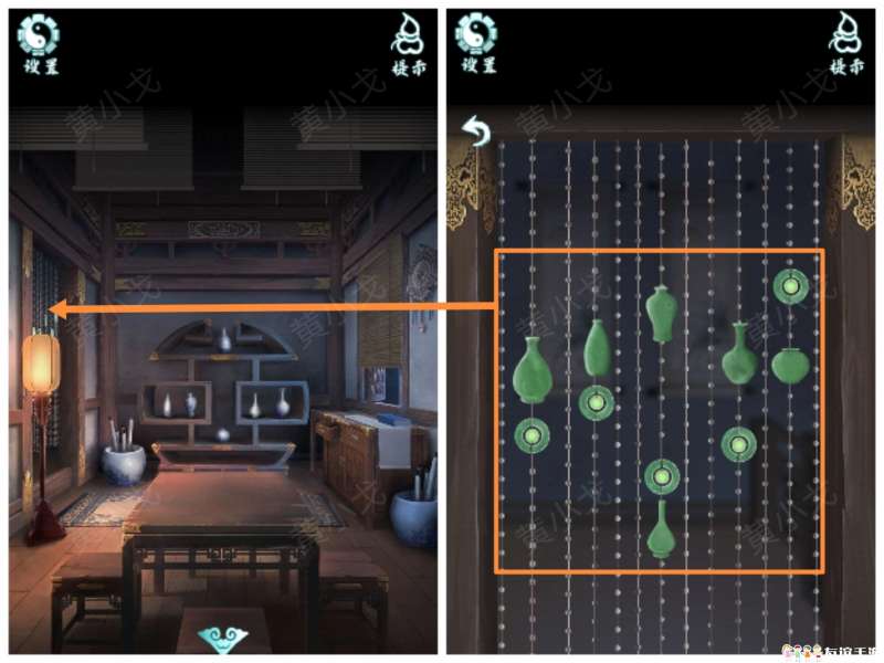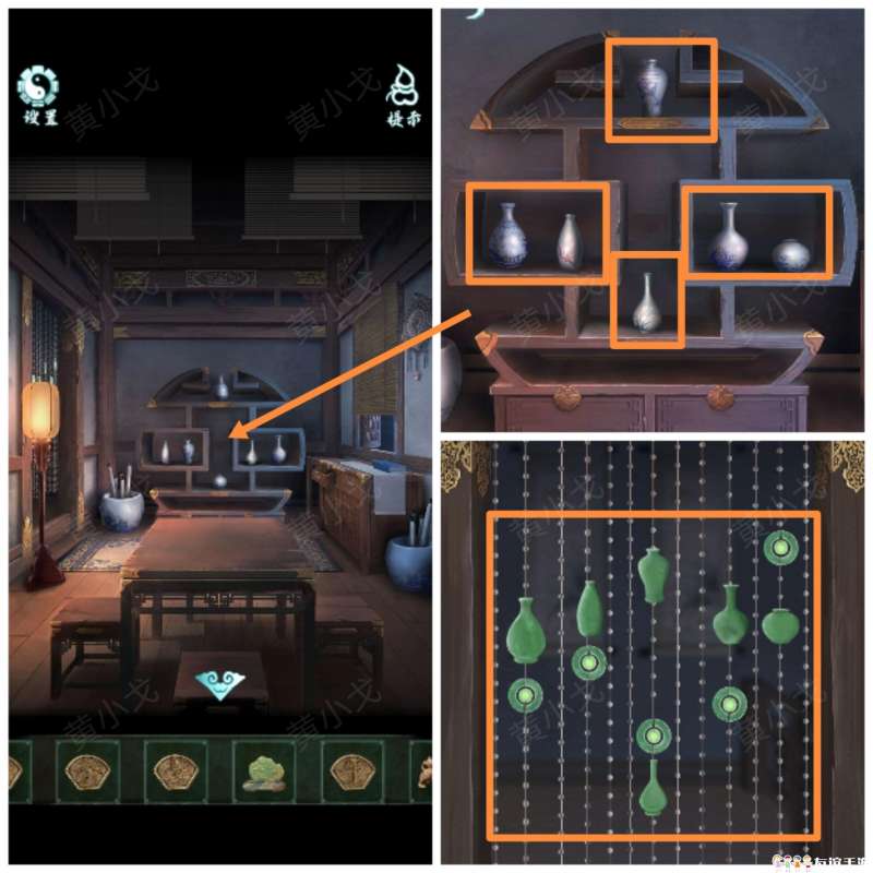 13.点击收藏架,根据挂牌线索,调整对应花瓶的位置