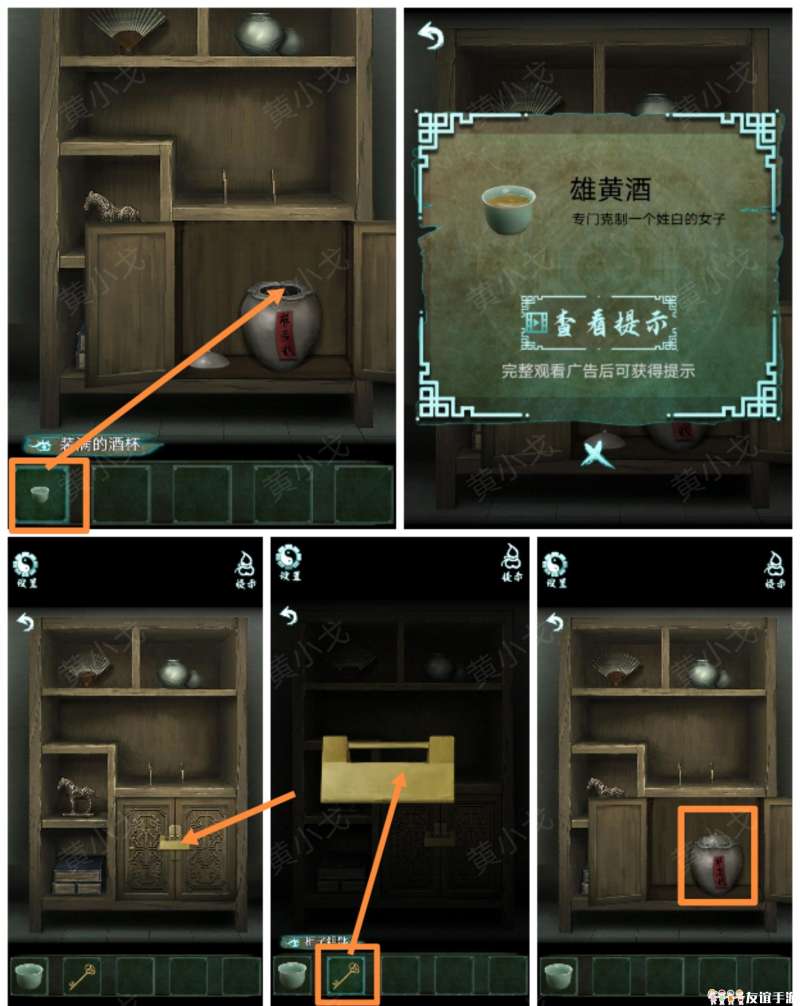 14.点击柜子,用【柜子钥匙】打开上锁的柜门;打开柜子,打开罐子的盖子,把雄黄粉放入【装满的酒杯】中,获得【雄黄酒】