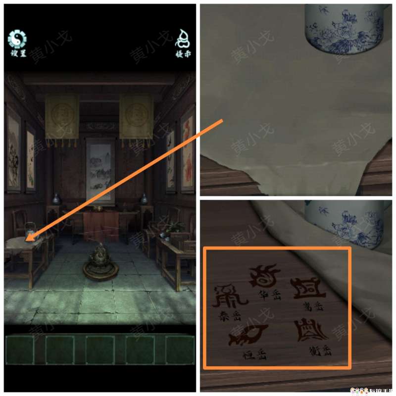 1.(前厅)点击左边的桌子,掀开桌布,获得线索(五岳和对应的符号)