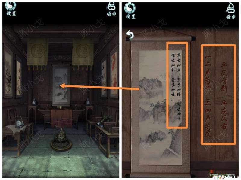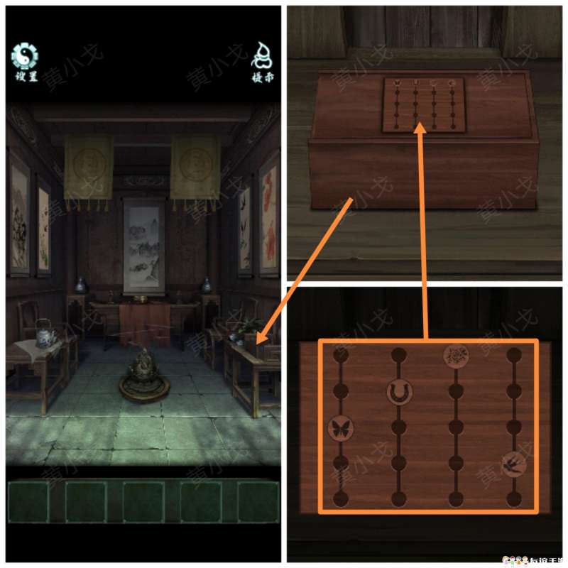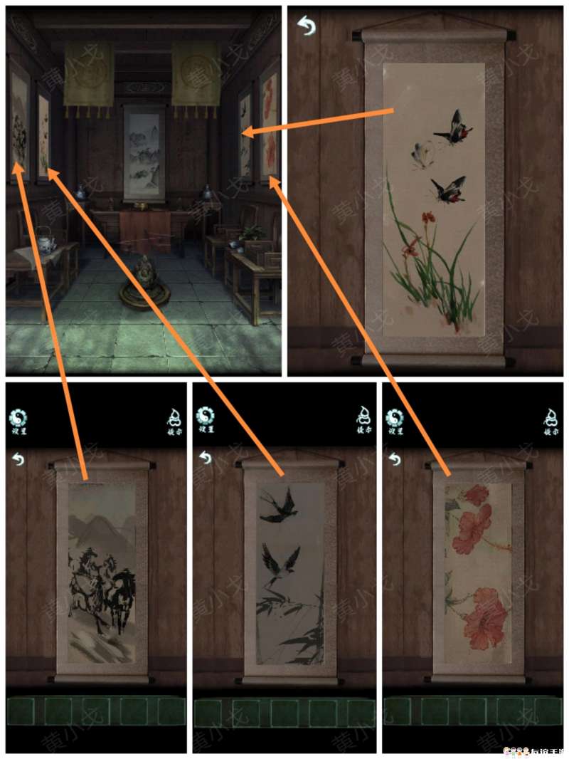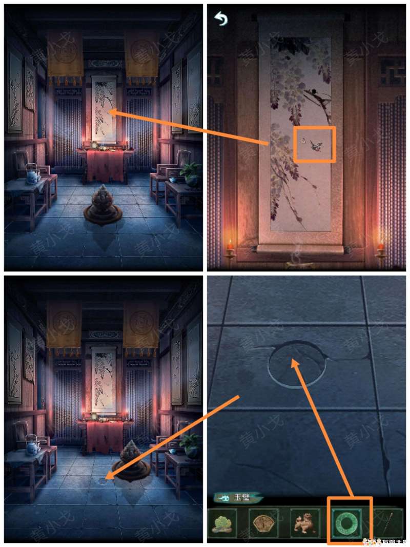 18.触发机关,点击中间挂画上的蝴蝶;地上的香炉挪开,出现凹槽,放上【玉璧】,出现暗道