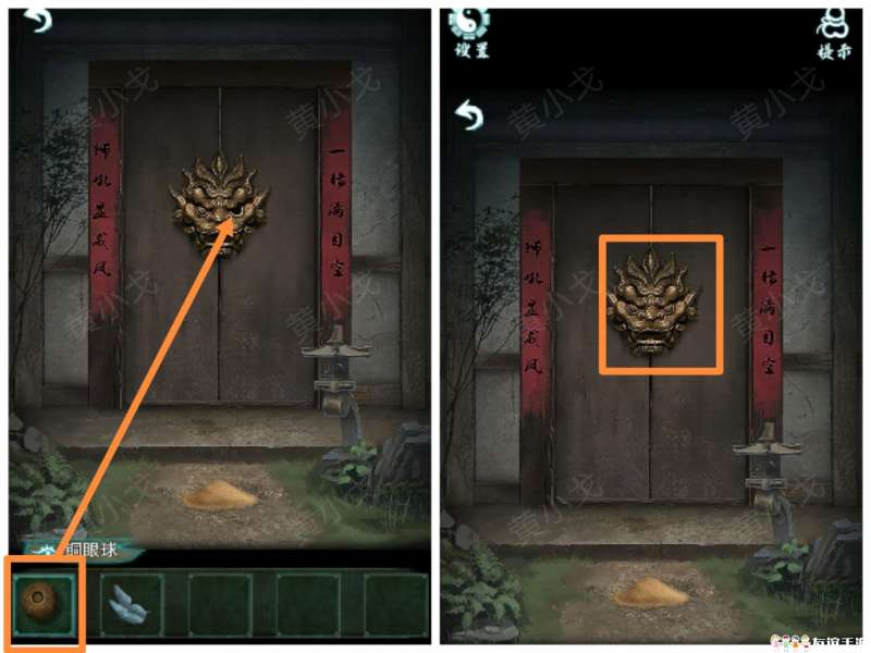 22.(画中-庭院)点击门,给石狮子机关装上【铜眼球】;转动眼球,打开门